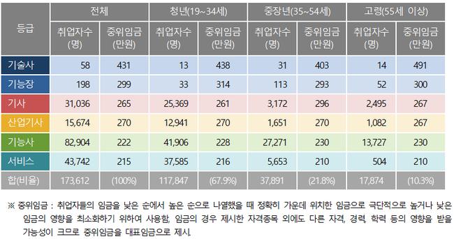 실제 자격 취득 후 1년 이내 취업자의 초임임금을 고용보험 자료로 분석한 결과, 기술사는 431만원으로 제시임금보다 103만원 높았고, 기능장(299만원), 산업기사(270만원), 기사는 265만원, 기능사는 222만원, 서비스 자격은 215만원으로 나타났다.