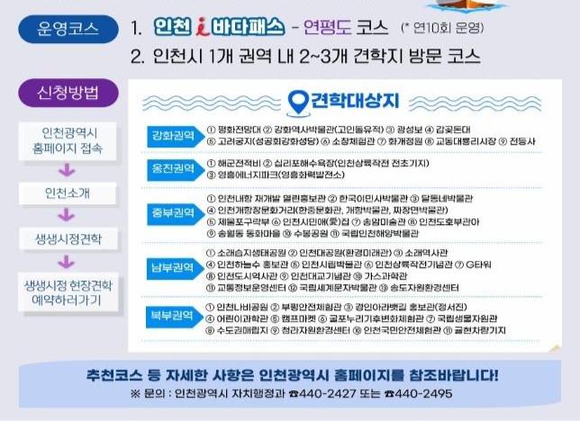 특히, 도서지역에 대한 시민들의 높은 관심을 반영해 강화권역에는 화개정원, 교동대룡리시장, 전등사 등 3개 견학지를 새롭게 추가했다. 옹진권역에서는 `인천 아이(i) 바다패스`와 연계해 연평도를 방문하는 `생생시정 보물섬 현장견학`을 연 10회 시범 운영한다.