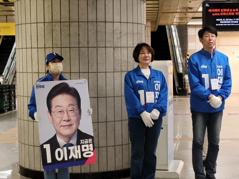 6월 2일 월요일 아침 가석오거리역에서 이재명 후보지지 유세를 하는 민주당 운동원들의 모습에서 “지난 대선에서 0.73% 차이로 대한민국을 어떻게 만들었는지, 대한민국이 얼마나 큰 위기에 빠지게 됐는지 다 기억하고 있다”며 “투표에 참여해서 진짜 대한민국을 만들기 위한 국민 의지를 보여야 한다”고 말했다.