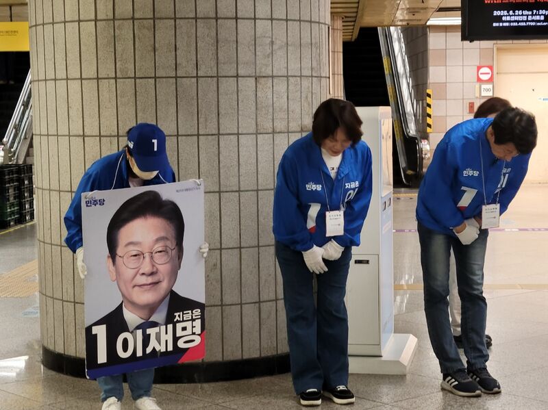 이재명후보 선거운동원들은 6월 3일 바로 내일 진짜 대한민국의 변화가 올것이라고 힘차게 아침 인사을 하였다.