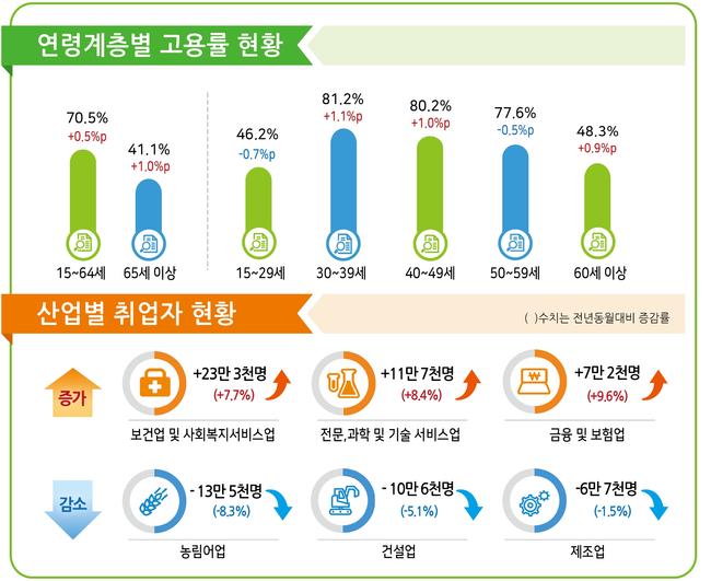 산업별 취업자 증감을 살펴보면, 보건업 및 사회복지 서비스업(23만 3천 명, 7.7% 증가), 전문, 과학 및 기술 서비스업(11만 7천 명, 8.4% 증가), 금융 및 보험업(7만 2천 명, 9.6% 증가) 등에서 크게 증가하며 서비스업을 중심으로 고용 창출이 활발했다.