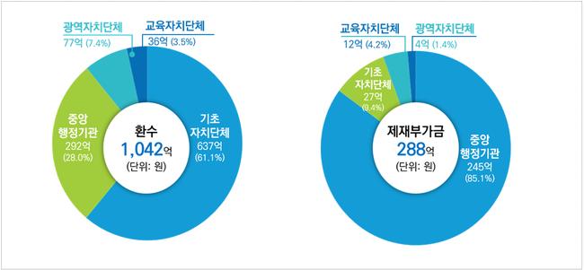 기관 유형별로는 기초지자체가 전체 환수액의 61.1%에 해당하는 637억 원을 환수해 가장 큰 비중을 차지했으며, 제재부가금은 중앙행정기관이 전체의 85.1%인 245억 원을 부과해 강도 높은 사후관리를 시행하고 있는 것으로 분석됐다.