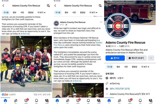 미국 아담스 카운티 소방서는 공식 SNS를 통해 “즉각적인 CPR과 침착한 현장 대응이 모든 소방관이 본받아야 할 행동이었다”며, “한국 소방대원들에게 진심으로 감사드린다”는 메시지를 전했다. 해당 게시물에는 구조 당시 상황과 한국 소방대원들의 단체사진이 함께 공유돼 시민들 사이에서도 깊은 감동을 자아냈다.