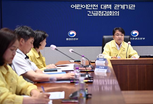 행정안전부는 7월 11일(금) 김광용 재난안전관리본부장 주재로 `어린이 안전대책 관계기관 긴급 점검회의`를 개최했다고 밝혔다. 이날 회의에는 교육부, 과기정통부, 문체부, 산업부, 복지부, 환경부, 여가부, 국토부, 해수부, 식약처, 경찰청, 소방청, 해경청, 원안위 등 14개 중앙행정기관과 17개 시·도 관계자들이 참석했다.