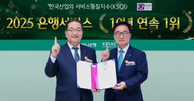 하나은행(은행장 이호성)은 한국능률협회컨설팅(대표이사 한수회, KMAC)이 주관하는 2025년 한국산업의 서비스품질지수(KSQI: Korean Service Quality Index) `고객 접점` 부문에서 10년 연속 1위 은행에 선정됐다고 밝혔다.