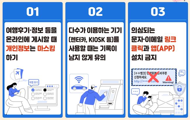 여름휴가철, ‘개인정보 3대 수칙’ 꼭 지키세요 - 개인정보위, 7월 28일부터 8월 31일까지 온라인 불법유통 집중 점검 - 후기 사진 속 항공권·전화번호 노출 주의… 렌터카·키오스크 사용 기록 삭제 필요 - 스미싱 문자·의심 링크 클릭 금지… 앱 설치 유도에 각별한 경계 당부