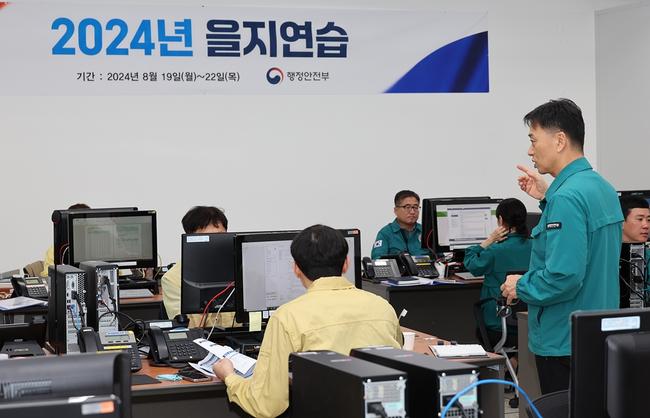 행정안전부(장관 윤호중)는 18일부터 21일까지 나흘간 전국 단위의 을지연습을 실시한다고 18일 밝혔다. 사진은 지난 2024년 전국 단위 을지연습이 실시 되는 가운데 행정안전부 직원들이 정부세종청사 전시종합상황실에서 근무를 하고 있는 모습.