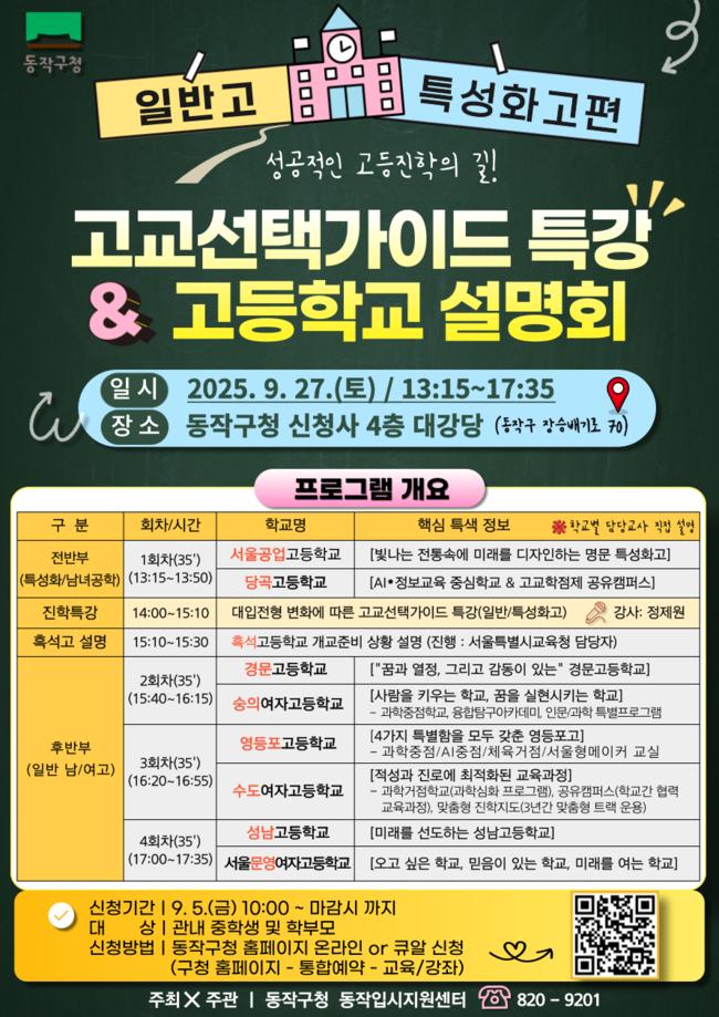 동작구(구청장 박일하)가 오는 27일(토) 오후 1시 15분부터 구청 신청사 4층 대강당과 소회의실에서 ‘고교 선택 가이드 특강 및 고등학교 설명회’를 개최한다고 밝혔다.