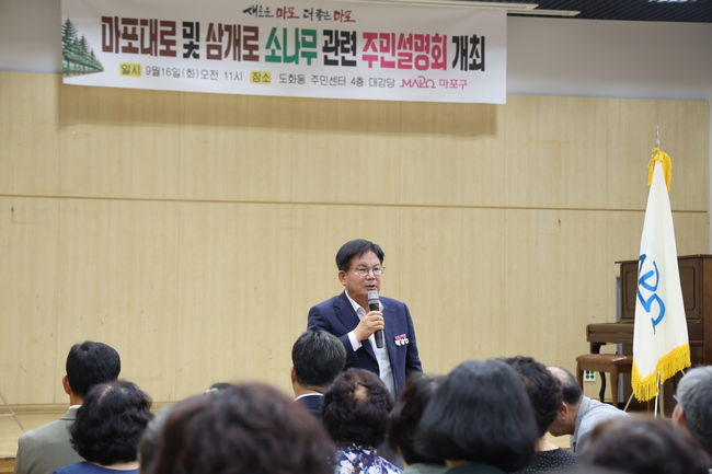 서울 마포구가 도화동 주민센터에서 ‘마포대로 및 삼개로 소나무 식재 주민설명회’를 열고, 소나무 사업 배경과 추진 경과, 향후 관리 계획을 주민들에게 설명했다.