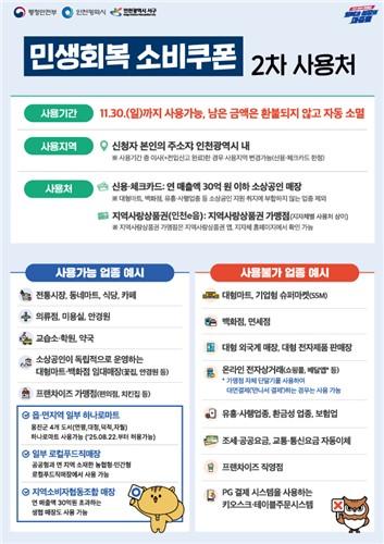 민생쿠폰은 지역사랑상품권(인천e음) 가맹점에서 사용가능하며, 신용·체크카드는 일부 업종을 제외하고 연 매출액이 30억 이하인 음식점, 카페, 동네 마트 등 소상공인 매장에서 사용할 수 있다.