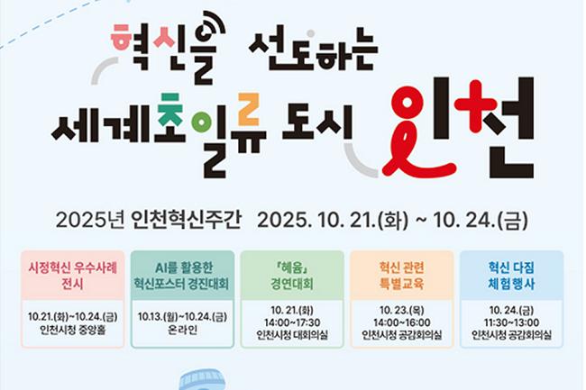 인천광역시(시장 유정복)는 혁신 행정의 성과를 확산하고 공직자의 혁신역량을 강화하기 위해 오는 10월 21일부터 24일까지 `2025 인천 혁신주간`을 개최한다고 밝혔다.
