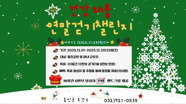 12월 걷기 챌린지와 관련해 자세한 사항은 옹진군보건소 건강증진과(721-0535)로 문의하면 된다.