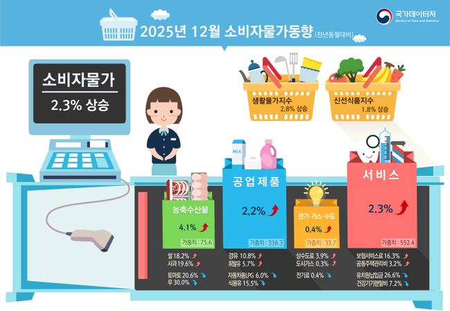 12월 소비자물가 2.3% 상승… 연간 상승률 2.1% - 전월 대비 0.3% 올라… 서비스·공업제품 중심 상승 - 근원물가 2.0% 유지, 생활물가 2.8%로 둔화 - 신선식품은 1.8% 상승… 채소 하락·과실·어개는 상승