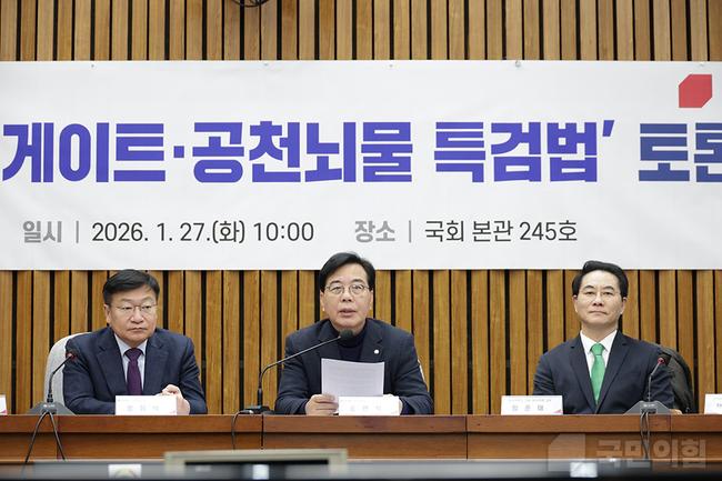 같은 날 열린 ‘통일교 게이트·공천뇌물 특검법’ 토론회에서도 송 원내대표는 특검 필요성을 거듭 강조했다. 그는 “특검은 살아 있는 권력에 대한 수사가 어려울 때 요구되는 제도”라며 “경찰, 검찰, 공수처 모두 정부·여당 통제 아래 있어 공정한 수사를 기대하기 어렵다”고 말했다. 이어 “정작 특검이 필요한 통일교 게이트와 공천뇌물 카르텔에 대해서는 수사가 지지부진하다”고 주장했다.