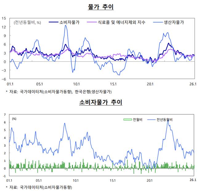 물가는 안정 흐름을 이어갔다. 1월 소비자물가는 전년 동월 대비 2.0% 상승해 지난해 12월(2.3%)보다 오름폭이 축소됐다. 농축수산물 가격 상승률이 4.1%에서 2.6%로 둔화됐고, 석유류 가격은 보합을 나타냈다. 식료품과 에너지를 제외한 근원물가도 2.0% 상승해 비교적 안정적인 흐름을 보였다.