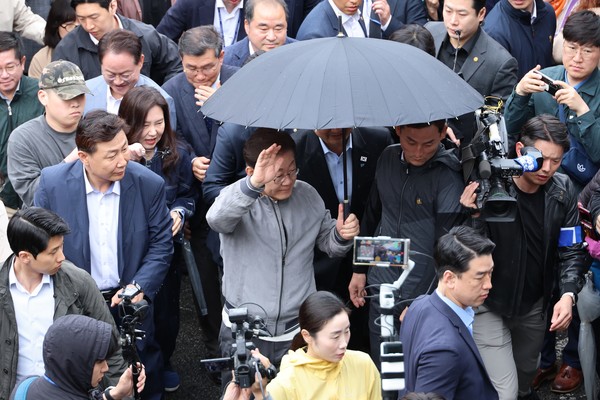강원 동해안 지역에서 ‘골목골목 경청투어’를 이어가고 있는 이재명 더불어민주당 대선 후보는 3일 이 후보에 대한 피습 모의 제보가 잇따르자 경호를 강화하고 대민 접촉은 자제한다고 밝혔다.