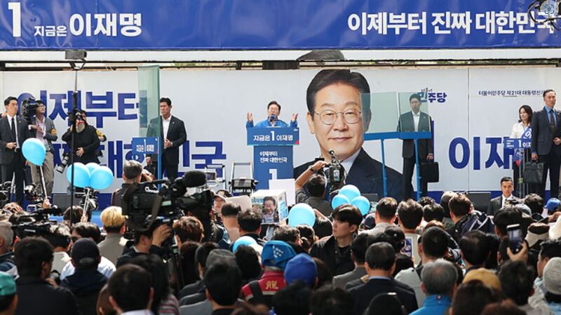 이재명 후보는 이날 서울 용산구 용산역 광장에서 열린 집중 유세에서 방탄 유리막이 설치된 연단에서 연설했다. 민주당은 후보 유세에 앞서 방탄 유리막을 세웠다.